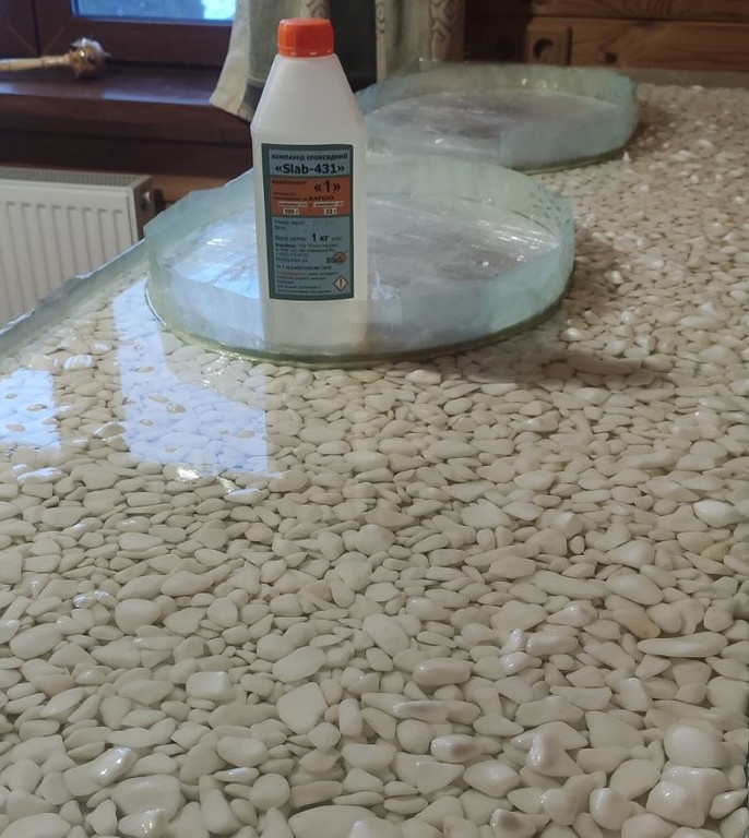 Любите Resin Art, але на стінах не залишилося місця? Зробіть практичну річ – оригінальну столешню або тумбу під умивальник чи мийку! З епоксидної смоли КЕ «Slab-431» та декоративного каміння така столешня буде не тільки красивою, а й водостійкою.